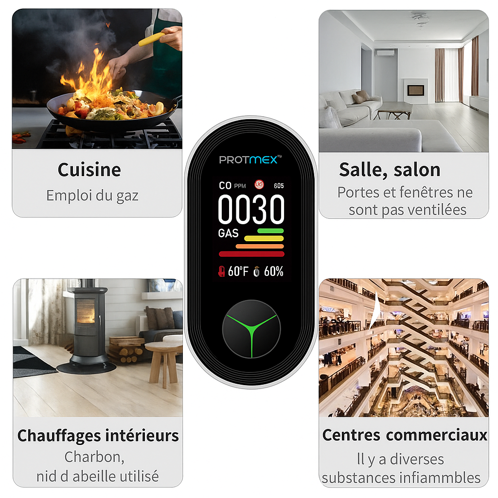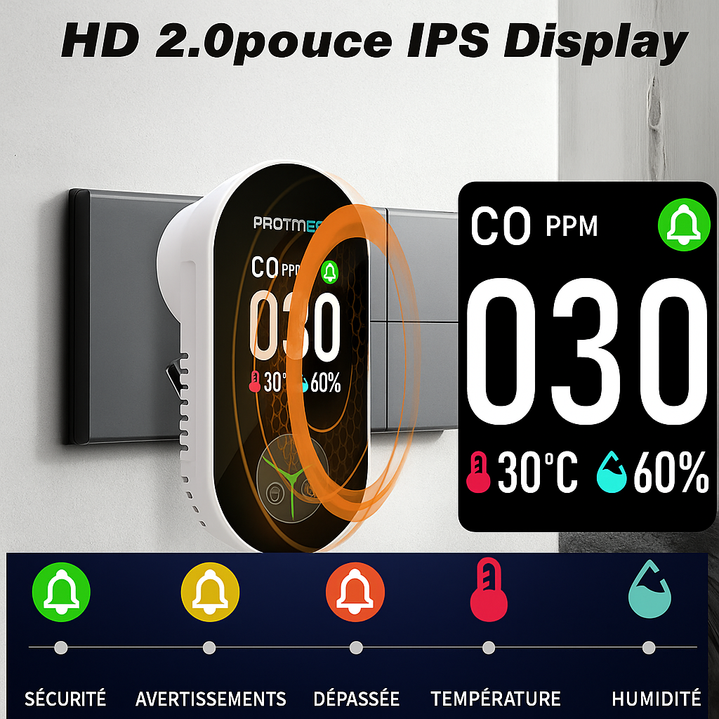 Ce sentiment d'insécurité de ne pas savoir si l'air est sain ? Fini. Le système Protmex 4 en 1 veille jour et nuit, déclenchant des alertes instantanées et puissantes dès qu'un danger apparaît. Fini le stress, fini les incertitudes : une solution plus intelligente et plus fiable pour protéger vos proches. Vous dormez mieux, car votre maison est plus sûre.
