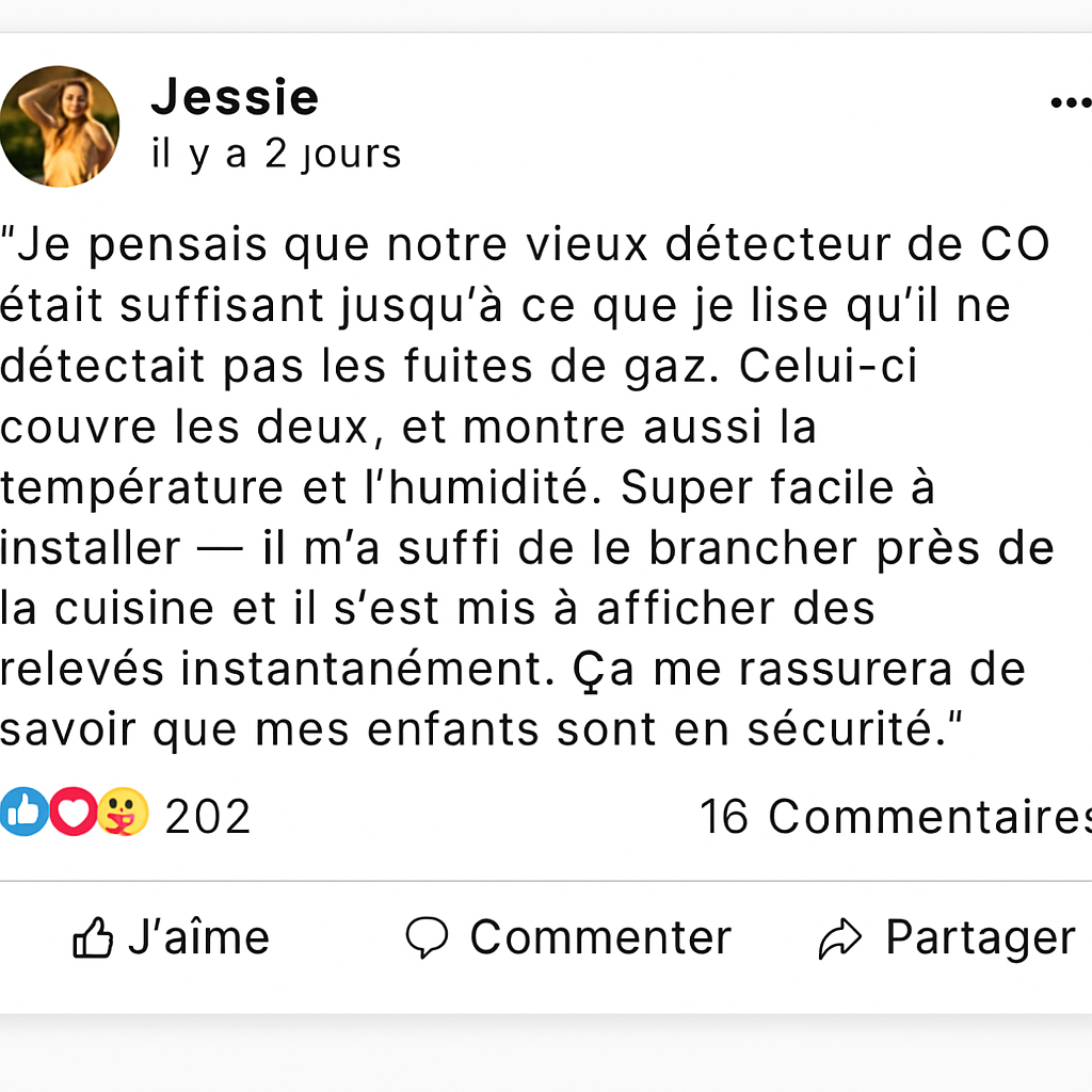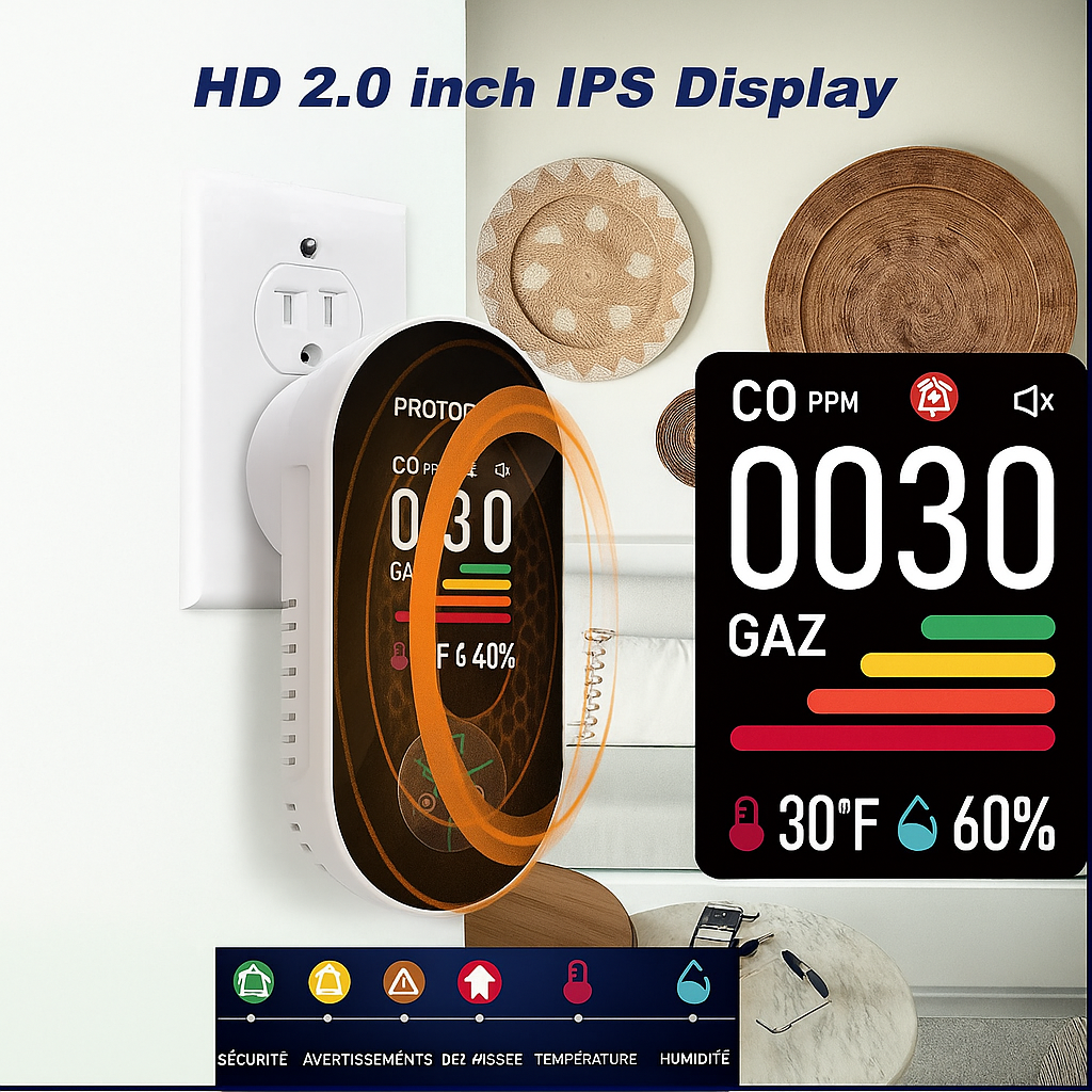 Avec une seule prise , votre maison est protégée. Les capteurs haute précision surveillent le monoxyde de carbone, le gaz naturel et le propane en temps réel, tandis que leur design élégant et compact s'intègre parfaitement à toutes les pièces. Votre famille se sent en sécurité, vous avez le contrôle, et vos invités ne remarquent même pas sa présence.